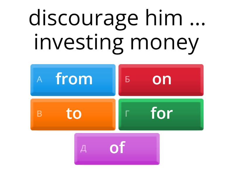 1) discourage him ... investing money a) from b) on c) to d) for e) of 2) donate money ... the project a) in b) on c) to d) for e) of 3) be eager ... visit the place a) in b) on c) to d) for e) of 4) be eager ... the concert a) in b) on c) to d) for e) of 5) escape ... prison a) in b) - c) from d) for e) of 6) escape ... prison a) in b) - c) from d) for e) of 7) be fascinated ... the beauty a) with b) by c) to d) for e) of 8) be fond ... reading a) with b) by c) to d) for e) of 9) distract him ... studying a) with b) by c) from d) for e) of 10) be good ... Physics a) in b) on c) at d) for e) of 11) Carrot is good ... your eyes. a) in b) on c) at d) for e) of 12) inspire people ... confidence a) in b) on c) at d) for e) with 13) They lack ... confidence. a) - b) on c) to d) for e) of 14) They lack ... confidence. a) - b) on c) to d) for e) of 15) passion ... science fiction a) about b) on c) to d) for e) of 16) have problems ... a car a) about b) on c) with d) for e) of 17) a shortage ... food a) about b) on c) with d) for e) of 18) a shortage ... food a) about b) on c) with d) for e) of 19) a source ... vitamins a) to b) on c) with d) for e) of 20) be skillful ... writing programmes a) at b) on c) with d) for e) of 21) suffer ... cancer a) at b) from c) with d) for e) of 22) take revenge ... deed a) at b) from c) with d) for e) of 23) take revenge ... deed a) at b) from c) with d) for e) of 24) treat teachers ... respect a) at b) from c) with d) for e) of 25) treat myself ... a cup of coffee a) at b) to c) with d) for e) of