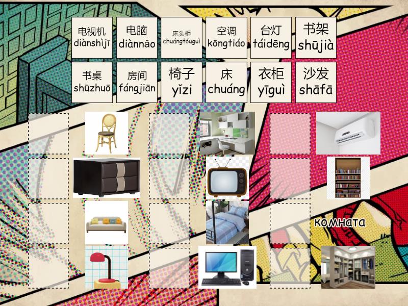 房间 fángjiān - комната, 床 chuáng , 衣柜 yīguì , 书桌 shūzhuō, 椅子 yǐzi , 电脑 diànnǎo , 电视机 diànshìjī , 沙发 shāfā , 书架 shūjià , 床头柜 chuángtóuguì , 空调 kōngtiáo , 台灯 táidēng,