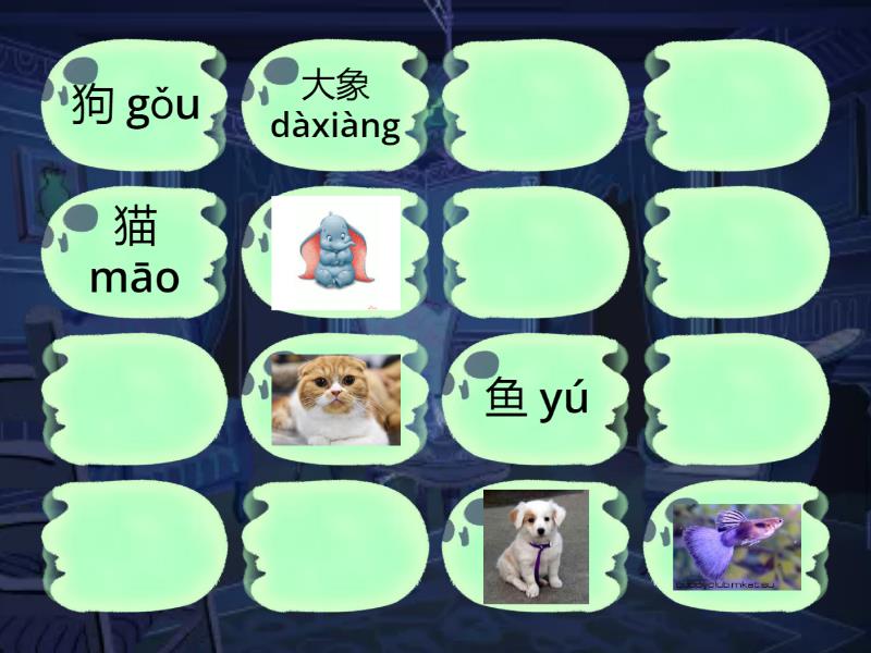 猫 māo, 狗 gǒu, 大象 dàxiàng, 鱼 yú, 虎 hǔ, 马 mǎ, 猴子 hóuzi, 小猫 xiǎomāo,