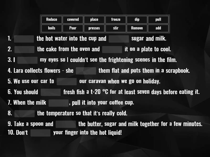 1. ____ the hot water into the cup and ____ sugar and milk. 2. ____ the cake from the oven and ____ it on a plate to cool. 3. I ____ my eyes so I couldn’t see the frightening scenes in the film. 4. Lara collects flowers - she ____ them flat and puts them in a scrapbook. 5. We use our car to ____ our caravan when we go on holiday. 6. You should ____ fresh fish a t-20 °C for at least seven days before eating it. 7. When the milk ____, pull it into your coffee cup. 8. ____ the temperature so that it’s really cold. 9. Take a spoon and ____ the butter, sugar and milk together for a few minutes. 10. Don’t ____ your finger into the hot liquid!