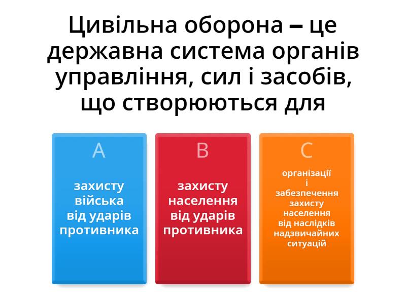 1) Цивільна оборона – це державна система органів управління, сил і засобів, що створюються для a) захисту війська від ударів противника b) захисту населення від ударів противника c) організації і забезпечення захисту населення від наслідків надзвичайних ситуацій 2) Начальником цивільної оборони України a) прем’єр-міністр України b) Міністр ЦО України c) Міністр МНС України 3) Порушення нормальної роботи певного механізму, яке призводить до значних пошкоджень, знищення матеріальних цінностей, ураження та загибелі людей, має назву a) аварія b) надзвичайна ситуація c) катастрофа d) 4) ВИЗНАЧТЕ ЗАЙВЕ ! Надзвичайні ситуації залежно від причин походження подій поділяються на a) соціально-політичні b) техногенні c) природні d) військові e) руйнівні 5) ВИЗНАЧТЕ ЗАЙВЕ! Надзвичайні ситуації залежно від обсягів заподіяних збитків поділяються на a) регіонального рівня b) державного рівня c) об’єктового рівня d) обласного рівня 6) Начальником ЦО навчального закладу є: a) Директор. b) Один із заступників. c) Викладач предмета «Захист Вітчизни». d) Голова профкому школи. e) Інша особа, призначена начальником управління освіти. 7) Надійним способом захисту від хімічної зброї є: a) Респіратор b) Протигаз c) Ватно-марлева пов'язка 8) У сховище (укриття) потрібно приходити зі своїми: a) засобами індивідуального захисту, продуктами харчування, документами; b) продуктами харчування, з теплим одягом на випадок евакуації, домашніми тваринами, якщо їх нікуди дівати; c) постільною білизною, продуктами,медикаментами, документами; d) всі відповіді вірні. 9) Дайте визначення, що таке рана a) травматичне ушкодження, яке загрожує життю потерпілого b) стан організму, за якого людина не здатна повноцінно і без шкоди для себе виконувати свої біологічні й соціальні функції c) це порушення нормальної життєдіяльності організму, що супроводжується болем і кровотечею d) пошкодження шкіри, слизових оболонок, тканин і органів, що супроводжуються болем, кровотечею і порушенням функцій організму 10) До сучасних звичайних засобів масового ураження належать: a) запалювальна зброя, боєприпаси об'ємного вибуху, осколкові боєприпаси; b) стрілецька зброя; c) авіаційні бомби і артилерійські снаряди; d) хімічні боєприпаси, сильнодіючі отруйні речовини; e) протитанкові керовані ракети, автоматичні гармати, самохідна артилерія.