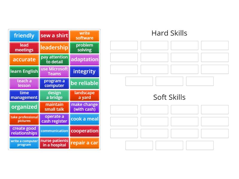 Hard Skills: write a computer program, design a bridge, operate a cash register, nurse patients in a hospital, landscape a yard, repair a car, write software, program a computer, teach a lesson, learn English, take professional pictures, cook a meal, make change (with cash), sew a shirt, use Microsoft Teams, Soft Skills: pay attention to detail, communication, maintain small talk, be reliable, problem solving, lead meetings, organized, leadership, accurate, adaptation, create good relationships, cooperation, time management, integrity, friendly,