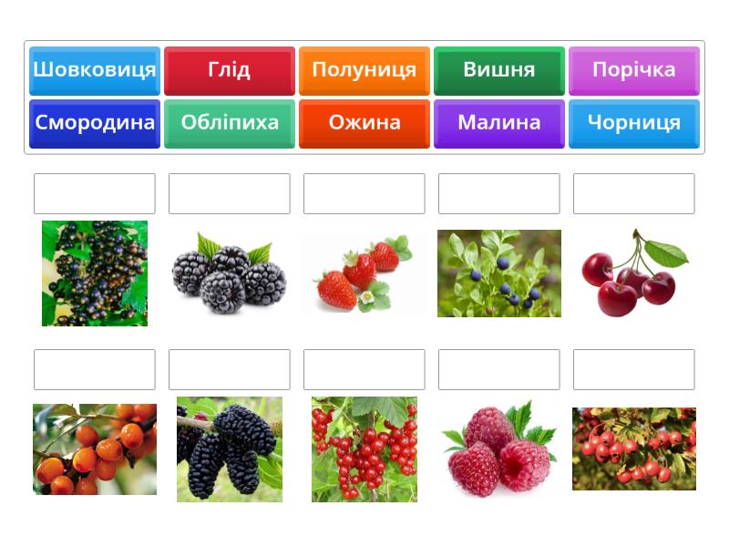 Малина, Полуниця, Ожина, Порічка, Чорниця, Глід, Вишня, Смородина, Шовковиця, Обліпиха,