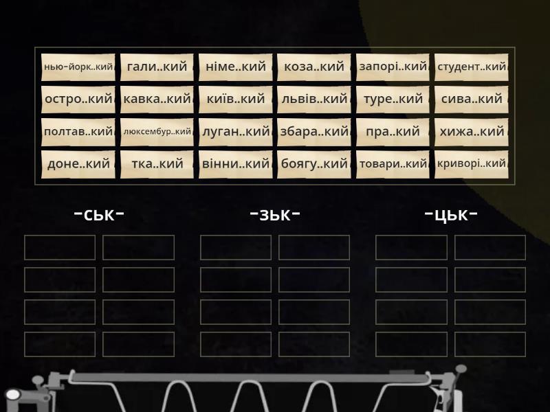 -ськ-: полтав..кий, львів..кий, луган..кий, студент..кий, нью-йорк..кий, товари..кий, київ..кий, сива..кий, -зьк-: кавка..кий, запорі..кий, пра..кий, збара..кий, люксембур..кий, криворі..кий, боягу..кий, остро..кий, -цьк-: доне..кий, тка..кий, хижа..кий, вінни..кий, коза..кий, німе..кий, туре..кий, гали..кий,