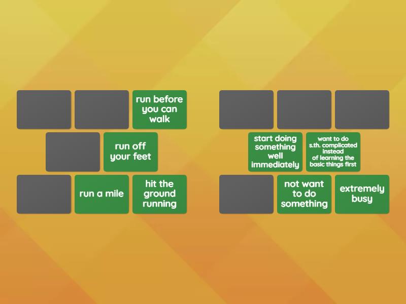 run a mile - not want to do something, hit the ground running - start doing something well immediately, run off your feet - extremely busy, run before you can walk - want to do s.th. complicated instead of learning the basic things first, run around in circles - think about s.th. without making any progress, get off to a running start - begin an activity very successfully, run the risk of - be in danger of, get s.th. up and running again - make s.th. work properly once more,