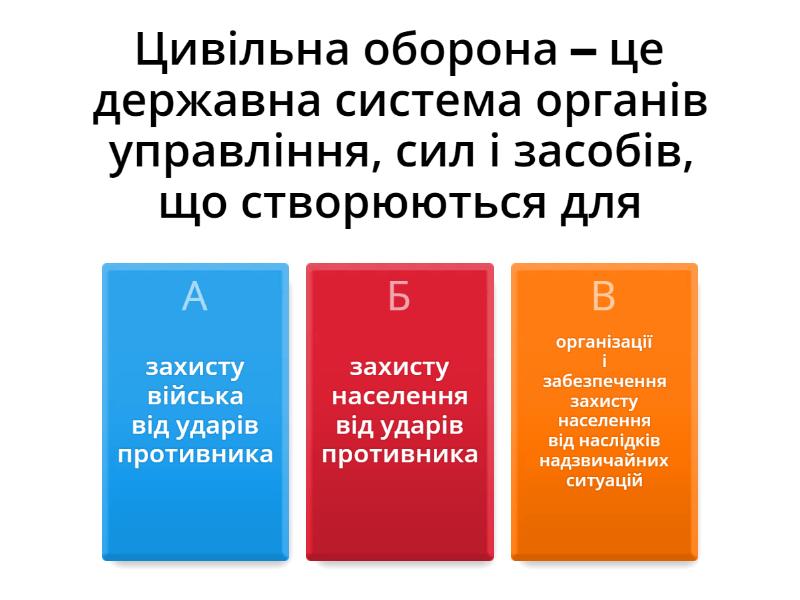 1) Цивільна оборона – це державна система органів управління, сил і засобів, що створюються для a) захисту війська від ударів противника b) захисту населення від ударів противника c) організації і забезпечення захисту населення від наслідків надзвичайних ситуацій 2) Начальником цивільної оборони України a) прем’єр-міністр України b) Міністр ЦО України c) Міністр МНС України 3) Порушення нормальної роботи певного механізму, яке призводить до значних пошкоджень, знищення матеріальних цінностей, ураження та загибелі людей, має назву a) аварія b) надзвичайна ситуація c) катастрофа d) 4) ВИЗНАЧТЕ ЗАЙВЕ ! Надзвичайні ситуації залежно від причин походження подій поділяються на a) соціально-політичні b) техногенні c) природні d) військові e) руйнівні 5) ВИЗНАЧТЕ ЗАЙВЕ! Надзвичайні ситуації залежно від обсягів заподіяних збитків поділяються на a) регіонального рівня b) державного рівня c) об’єктового рівня d) обласного рівня 6) Начальником ЦО навчального закладу є: a) Директор. b) Один із заступників. c) Викладач предмета «Захист Вітчизни». d) Голова профкому школи. e) Інша особа, призначена начальником управління освіти. 7) Надійним способом захисту від хімічної зброї є: a) Респіратор b) Протигаз c) Ватно-марлева пов'язка 8) У сховище (укриття) потрібно приходити зі своїми: a) засобами індивідуального захисту, продуктами харчування, документами; b) продуктами харчування, з теплим одягом на випадок евакуації, домашніми тваринами, якщо їх нікуди дівати; c) постільною білизною, продуктами,медикаментами, документами; d) всі відповіді вірні. 9) Дайте визначення, що таке рана a) травматичне ушкодження, яке загрожує життю потерпілого b) стан організму, за якого людина не здатна повноцінно і без шкоди для себе виконувати свої біологічні й соціальні функції c) це порушення нормальної життєдіяльності організму, що супроводжується болем і кровотечею d) пошкодження шкіри, слизових оболонок, тканин і органів, що супроводжуються болем, кровотечею і порушенням функцій організму 10) До сучасних звичайних засобів масового ураження належать: a) запалювальна зброя, боєприпаси об'ємного вибуху, осколкові боєприпаси; b) стрілецька зброя; c) авіаційні бомби і артилерійські снаряди; d) хімічні боєприпаси, сильнодіючі отруйні речовини; e) протитанкові керовані ракети, автоматичні гармати, самохідна артилерія. 11) Єдиний сигнал оповіщення населення такий: a) «Тривога!» b) «Увага всім!» c) «Слухайте об’яву» d) «Покинути приміщення» 12) Оповіщення населення про надзвичайні ситуації здійснюється через: a) Радіо, телебачення, мобільний зв'язок b) Поштовим голубом c) Комп'ютерні ігри 13) Вкажіть номери екстренних служб? a) 101 b) 112 c) 103 d) 102 e) 104 f) 116 14) Ваші дії, якщо ви побачили підозрілий предмет на вулиці a) подивитись, що в коробці чи пакеті b) попередити перехожих c) спробувати знешкодити знахідку самостійно d) зателефонувати 101 або 102 e) позначити місце 15) Які основні дії потрібно здійснити під час евакуації? a) Зібрати особисті речі b) подзвонити родичам c) випустити домашніх тварин d) перекрити газ, воду та електрику перед виходом. 16) Які основні правила поведінки під часевакуації? a) Залишатися спокійним b) Слідувати інструкціям вчителів c) Не тікати, не панікувати d) Усі вищезгадані відповіді 17) Які існують види вогнегасників? a) порошкові, вуглекислотні, пінні b) водяні, мильні c) великі і маленькі.