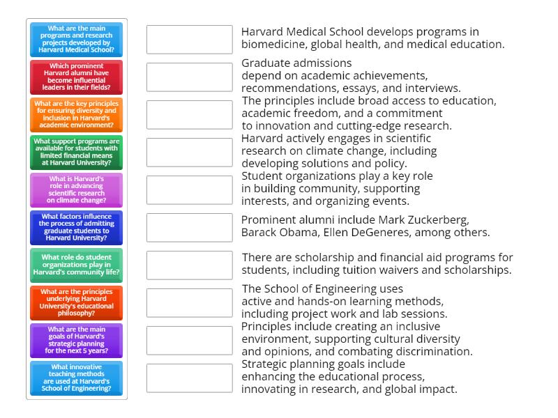 What are the principles underlying Harvard University's educational philosophy? - The principles include broad access to education, academic freedom, and a commitment to innovation and cutting-edge research., What are the main programs and research projects developed by Harvard Medical School? - Harvard Medical School develops programs in biomedicine, global health, and medical education., What role do student organizations play in Harvard's community life? - Student organizations play a key role in building community, supporting interests, and organizing events., What factors influence the process of admitting graduate students to Harvard University? - Graduate admissions depend on academic achievements, recommendations, essays, and interviews., What are the main goals of Harvard's strategic planning for the next 5 years? - Strategic planning goals include enhancing the educational process, innovating in research, and global impact., What innovative teaching methods are used at Harvard's School of Engineering? - The School of Engineering uses active and hands-on learning methods, including project work and lab sessions., Which prominent Harvard alumni have become influential leaders in their fields? - Prominent alumni include Mark Zuckerberg, Barack Obama, Ellen DeGeneres, among others., What is Harvard's role in advancing scientific research on climate change? - Harvard actively engages in scientific research on climate change, including developing solutions and policy., What support programs are available for students with limited financial means at Harvard University? - There are scholarship and financial aid programs for students, including tuition waivers and scholarships., What are the key principles for ensuring diversity and inclusion in Harvard's academic environment? - Principles include creating an inclusive environment, supporting cultural diversity and opinions, and combating discrimination.,