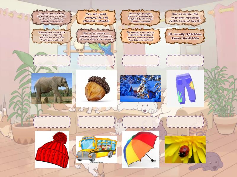 На голову вдягаємо, вушка захищаємо, Здивувалась дітвора:„Це тварина чи гора?Як же їсть він, як він п'є? А для цього хобот є, Червона крапочка літає, На крилах чорні цятки має, У квіточках ховається, Сонечку всміхається, Усіх від сонця захищає, Як той грибочок називає?, По маршруту вас везуть, І квиточки продають, З вигляду продовгуватий, Але зовсім не рогатий, Що то за сорочка — рукави ніврочку? І чомусь на ноги вбрали ту сорочку, Сніг на полях, Лід на річках, Метелиця гуляє, Коли це буває? , Він на дубі виростає, Шапочку гарненьку має, З дуба в землю упаде, І весною проросте,