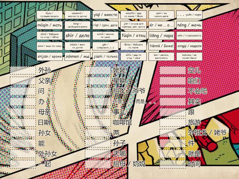 wèn / спрашивать - 问, qíshí / на самом деле - 其实, ér / не ... а ... - 不是。。。而是。。。, bùhuìba / не может быть! - 不会吧, jiùshì / только - 就是, tiānnǎ / Боже! - 天哪, fùqìn / отец - 父亲, mǔqin / мать - 母亲, zǔfú / дед по отцу / yéye - 祖父 / 爷爷, zǔmǔ / бабушка по отцу / nǎinai - 祖母 / 奶奶, wàizǔfù / дед по маме / lǎoye - 外祖父 / 姥爷, lǎolao / бабушка по маме - 姥姥, sūnzi / внук по сыну - 孙子, sūnnǚ / внучка по сыну - 孙女, wàisūn / внук по дочке - 外孙, wàisūnnǚ / внучка по дочке - 外孙女, rìqī / срок, дата - 日期, liǎng / пара - 两, shíjiān / время - 时间, kòngr / свободное время - 空儿, shìr / дело - 事儿, gēn / следовать, с, у - 跟, 。。。yuǎn / кафе - 咖啡馆, yīqǐ / вместе - 一起, bàn / делать, выполнять - 办, jiàn / сч.суф для одежды, дел, док-в - 件, néng / мочь - 能, xīngqī / неделя - 星期, lǚyóu / путешествовать - 旅游, zánmen / мы - 咱们,