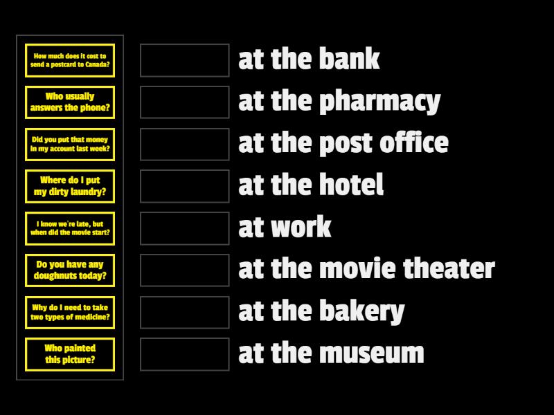 Why do I need to take two types of medicine? - at the pharmacy, Did you put that money in my account last week? - at the bank, Do you have any doughnuts today? - at the bakery, I know we’re late, but when did the movie start? - at the movie theater, Where do I put my dirty laundry? - at the hotel, Who painted this picture? - at the museum, How much does it cost to send a postcard to Canada? - at the post office, Who usually answers the phone? - at work,
