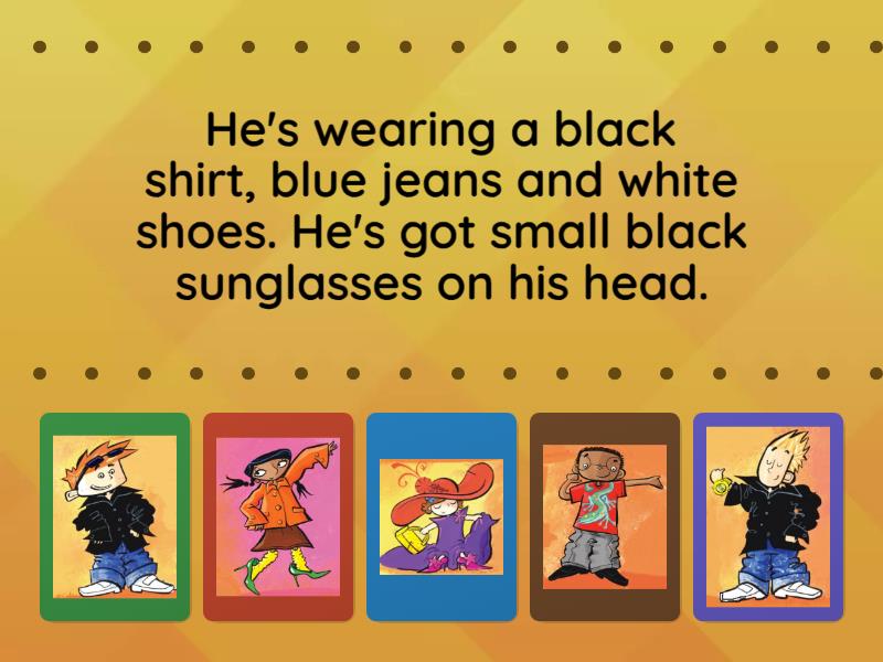 He's wearing a black shirt, blue jeans and white shoes. He's got small black sunglasses on his head., He's wearing a black shirt, blue jeans and white shoes. He's got a new watch., She’s wearing a short brown skirt and an orange jacket. She's wearing long yellow socks and green shoes., She's wearing a long purple dress and big pink shoes. She's wearing a nice big red hat and she's got a beautiful gold handbag., He’s wearing grey trousers, black shoes, and a red T-shirt with a green lizard on. What a beautiful T-shirt!,