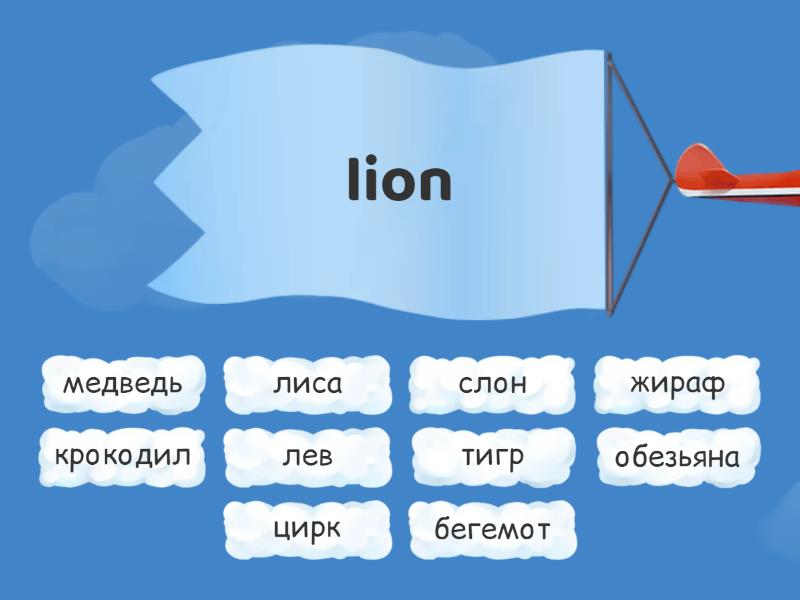 лев - lion, тигр - tiger, слон - elephant, бегемот - hippo, обезьяна - monkey, жираф - giraffe, лиса - fox, медведь - bear, крокодил - crocodile, цирк - circus,