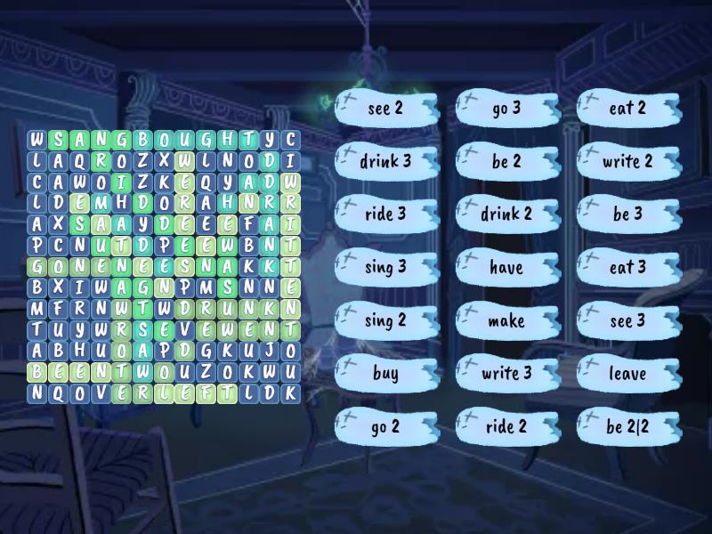 been - be 3, made - make, gone - go 3, was - be 2, were - be 2|2, saw - see 2, rode - ride 2, ridden - ride 3, seen - see 3, had - have, drunk - drink 3, sang - sing 2, left - leave, drank - drink 2, wrote - write 2, sung - sing 3, written - write 3, bought - buy , went - go 2, ate - eat 2, eaten - eat 3,