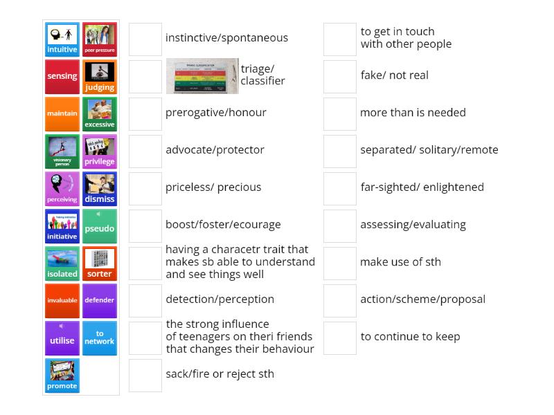 peer pressure - the strong influence of teenagers on theri friends that changes their behaviour, excessive - more than is needed, to network - to get in touch with other people, maintain - to continue to keep , isolated - separated/ solitary/remote, invaluable - priceless/ precious, promote - boost/foster/ecourage, initiative - action/scheme/proposal, privilege - prerogative/honour, sorter - triage/ classifier, sensing - detection/perception, intuitive - instinctive/spontaneous, judging - assessing/evaluating, perceiving - having a characetr trait that makes sb able to understand and see things well, defender - advocate/protector, visionary person - far-sighted/ enlightened, dismiss - sack/fire or reject sth, pseudo - fake/ not real, utilise - make use of sth,