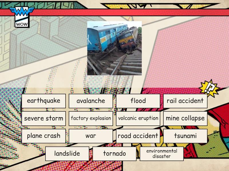 rail accident, landslide, flood, factory explosion, road accident, plane crash, severe storm, environmental disaster, tsunami, earthquake, war, avalanche, tornado, volcanic eruption, mine collapse,