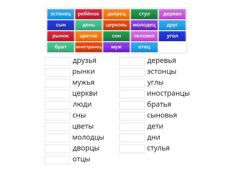 человек - люди, цветок - цветы, ребёнок - дети, муж - мужья, сын - сыновья, стул - стулья, брат - братья, дерево - деревья, друг - друзья, иностранец - иностранцы, эстонец - эстонцы, отец - отцы, молодец - молодцы, рынок - рынки, дворец - дворцы, день - дни, угол - углы, сон - сны, церковь - церкви,