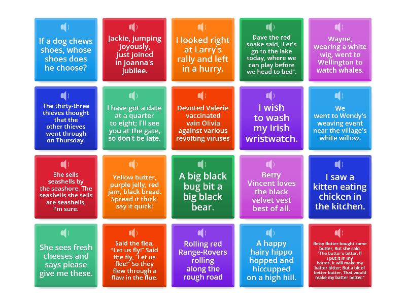 She sells seashells by the seashore. The seashells she sells are seashells, I'm sure. , We went to Wendy's weaving event near the village's white willow., I saw a kitten eating chicken in the kitchen., I wish to wash my Irish wristwatch., Betty Vincent loves the black velvet vest best of all., A big black bug bit a big black bear., I looked right at Larry’s rally and left in a hurry., Jackie, jumping joyously, just joined in Joanna's jubilee., If a dog chews shoes, whose shoes does he choose?, I have got a date at a quarter to eight; I’ll see you at the gate, so don’t be late., Wayne, wearing a white wig, went to Wellington to watch whales., Rolling red Range-Rovers rolling along the rough road, The thirty-three thieves thought that the other thieves went through on Thursday., A happy hairy hippo hopped and hiccupped on a high hill., She sees fresh cheeses and says please give me these., Yellow butter, purple jelly, red jam, black bread. Spread it thick, say it quick!, Devoted Valerie vaccinated vain Olivia against various revolting viruses, Dave the red snake said, 'Let's go to the lake today, where we can play before we head to bed”., Betty Botter bought some butter, But she said, “The butter’s bitter. If I put it in my batter, It will make my batter bitter; But a bit of better butter, That would make my batter better.”, Said the flea, “Let us fly!” Said the fly, “Let us flee!” So they flew through a flaw in the flue.,