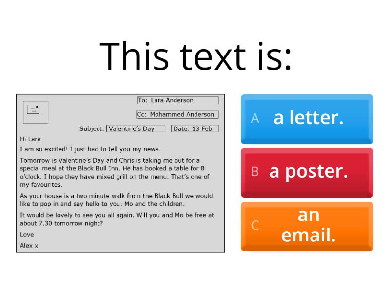 1) This text is: a) a letter. b) a poster. c) an email. 2) The main purpose of this text is to: a) ask Lara if she'll be at home tomorrow evening. b) wish Lara a happy Valentine's Day. c) tell Lara to stay in tomorrow night. 3) What time is Alex eating at the Black Bull Inn? a) 8 o'clock b) in 2 minutes c) 7:30 d) 13:00 4) Who is Alex having a meal with? a) Mo b) Lara c) Chris 5) What is the singular form of children? a) childs b) child c) childrens 6) Alex emailed Lara on: a) Valentine's day. b) the day before Valentine's Day. c) the day after Valentine's Day. 7) The salmon is served with a) crisps b) toast c) bread d) salad 8) Which item is served with peas? a) risotto b) mixed grill c) pasta d) cheese tart 9) The chocolate cake is served with a) cream b) ice cream c) custard 10) Which items are gluten free? a) ice cream b) cake c) crumble d) risotto e) pasta 11) How many vegetarian main courses are on the menu? a) one b) two c) three 12) What is the plural of tomato? a) tomotos b) tomtoes c) tomatoes d) tomates
