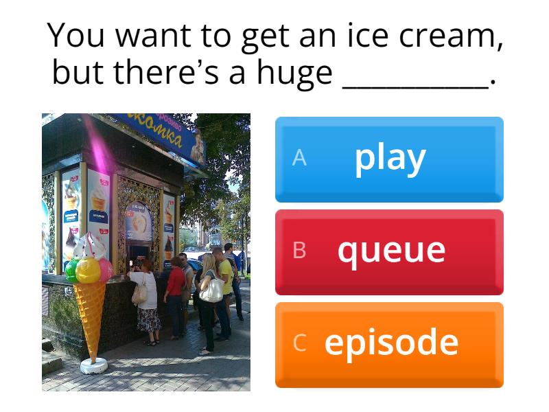 1) You want to get an ice cream, but there’s a huge __________. a) play b) queue c) episode 2) Your friend Sam is having a birthday next week. You want to _______ a big party for Sam. a) go out  b) worth it c) throw 3) You want to get the bus because getting a taxi ______ ___ ____________. a) wait for ages b) costs a fortune c) tidy up 4) You would like to go out for dinner tonight in a cafe, but you'll have to wait for ages in a queue, and you don’t think it’s _________ ___. a) worth it b) costs a fortune c) get home 5) After a party, there’s a huge mess in your flat. You want to ______ ____ _______ and tidy up in the morning. a) go on to b) getting the bus c) get to bed 6) You’ve been out for a meal with colleagues. And now, you want to ____ ____ to a club and dance. a) get home b) go on c) stay in 7) It’s your friend Sam’s birthday. You think Sam would like a quiet dinner with friends at home to ____________. a) tidy up b) get a taxi c) celebrate