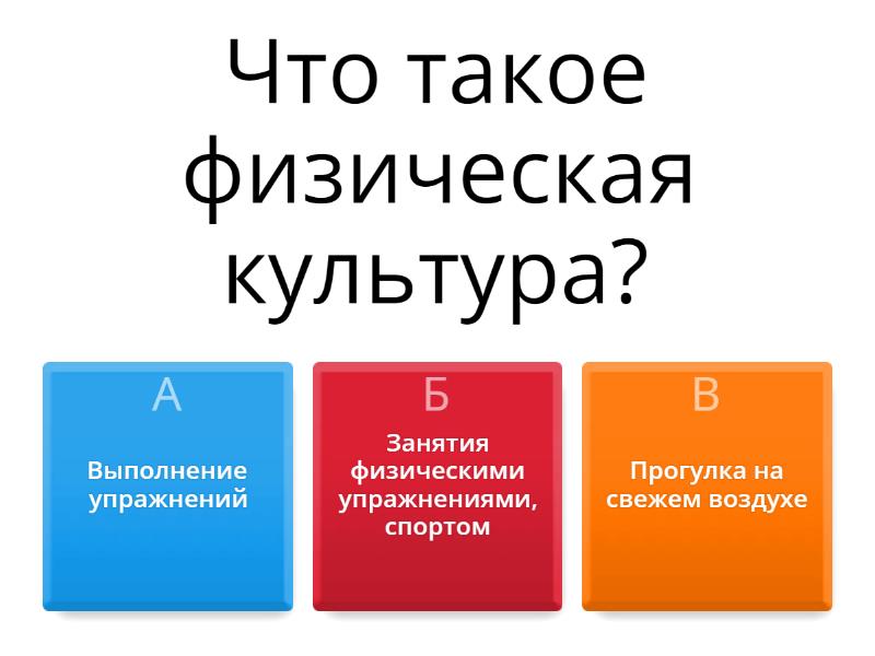 1) Что такое физическая культура? a) Прогулка на свежем воздухе b) Занятия физическими упражнениями, спортом c) Выполнение упражнений 2) Что помогает проснуться нашему организму? a) Будильник b) Утренняя зарядка c) Завтрак 3) Физические качества человека - это a) Вежливость, терпение, жадность b) Грамотность, лень, мужрость c) Сила, быстрота, выносливость, гибкость, ловкость 4) Выберите лишний предмет a) Обруч b) Мяч c) Телефон 5) Виды построений на уроке физической культуры? a) Шеренга, круг, колонна b) Квадрат c) Линейка