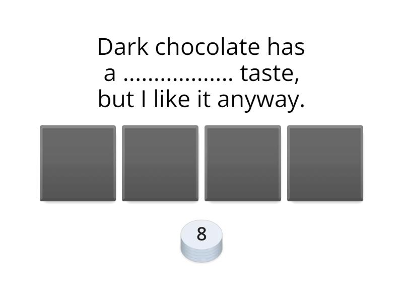 1) Dark chocolate has a .................. taste, but I like it anyway. a) bitter b) hard c) heavy d) raw 2) My least ..................... food is cauliflower. I don't like the smell. a) pleasant b) delicious c) special d) favourite 3) Young children often change their ................ very easily. a) senses b) minds c) moods d) reasons 4) Please .......................... the clothes on the line a) attach b) drop c) connect d) hang 5) A lot of people find it difficult to ........... that they are wrong. a) complain b) advise c) admit d) warn 6) People are more ................... to help you if you are nice to them. a) likely b) possible c) reasonable d) sure 7) The maths problem we had for homework was very ................ I didn't know how to do it. a) expert b) complicated c) heavy d) confused 8) Try not to ............... anything on the ground. a) let b) fall c) drop d) leave 9) I ....................... a lot of things when I looked outside the window this morning. a) noticed b) advised c) watched d) studied 10) She is very ....................... at her job. a) experienced b) intelligent c) correct d) keen 11) There were only a small .................. of students in class today. a) group b) total c) amount d) number 12) There was only a small .................. of money on the table a) group b) total c) amount d) number 13) We need to .................... out an experiment for homework. a) take b) carry c) make d) check 14) What is a synonym for pleasant? a) delicious b) happy c) nice d) new 15) What is raw food? a) food that is not cooked b) food that is cooked 16) She ...............................me about the mosquitos and told me to wear long sleeves, a) warned b) checked c) listened d) said