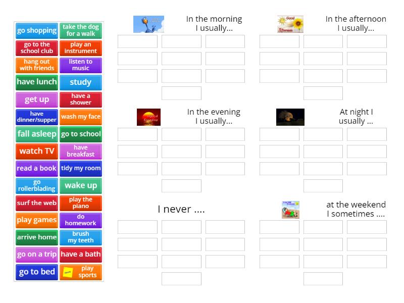 In the morning I usually...: wake up, get up, brush my teeth, wash my face, have breakfast, have a shower, go to school, study, In the afternoon I usually...: go to the school club, arrive home, hang out with friends, go shopping, do homework, play games, listen to music, read a book, surf the web, have lunch, In the evening I usually...: have dinner/supper, tidy my room, play an instrument, watch TV, At night I usually ...: go to bed, fall asleep, I never ....: play sports, go rollerblading, take the dog for a walk, have a bath, at the weekend I sometimes ....: go on a trip, play the piano,