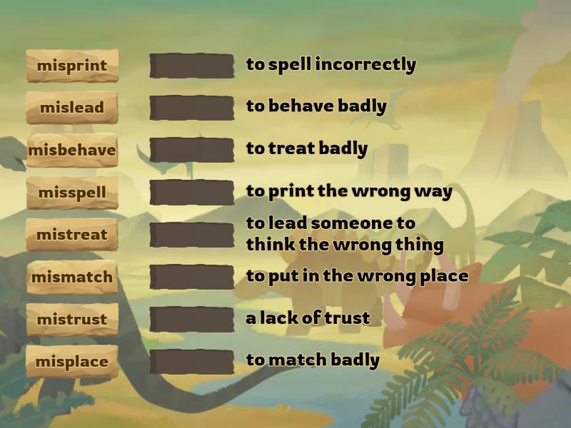 mismatch - to match badly, mistreat - to treat badly, misspell - to spell incorrectly, mistrust - a lack of trust, misprint - to print the wrong way, misbehave - to behave badly, misplace - to put in the wrong place, mislead - to lead someone to think the wrong thing,
