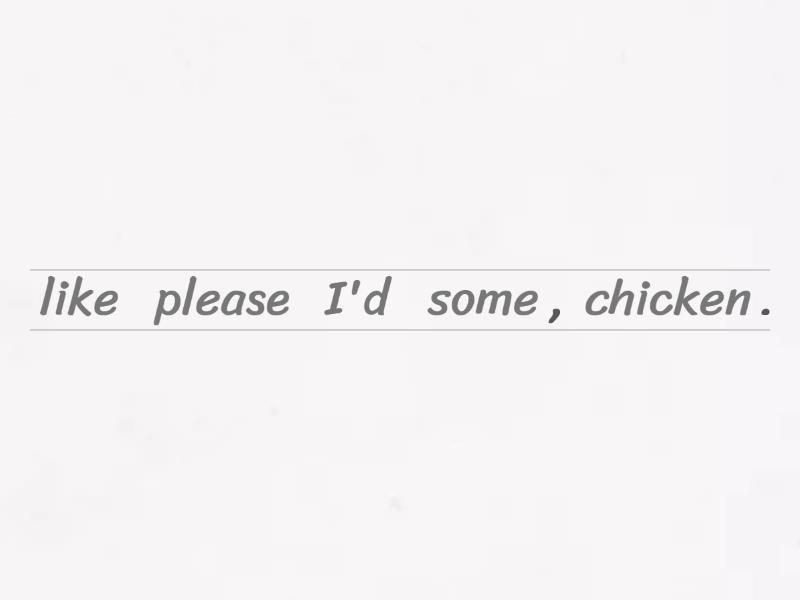 I'd like some chicken, please., Would you like anything else?, Would you like some coffee?, What would they like to eat?, When would he like to go?, We'd like a flat with two bedrooms., I like apple juice., They like Italian food.,