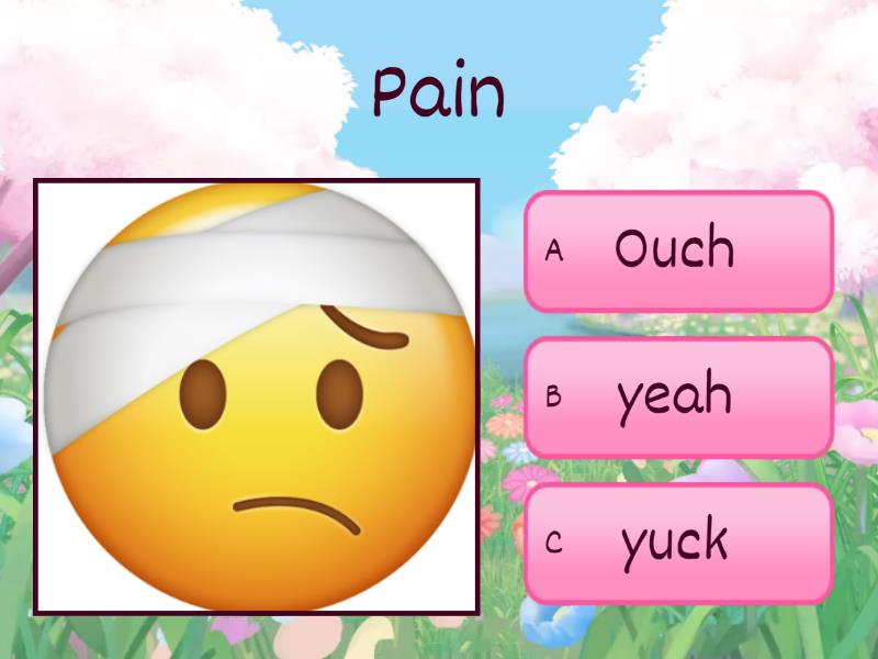 1) Pain a) Ouch b) yeah c) yuck 2) Disgust a) meh b) ew c) yippee 3) surprise a) wow b) huh c) hmm 4) Disapproval a) whew b) ahh c) tsk-tsk 5) panic a) oops b) help c) dear 6) realisation a) aha b) ho-hum c) eh 7) pity a) alas b) ahem c) oh 8) doubt a) woo-hoo b) hmm c) meh 9) disappointment a) meh b) er c) ugh 10) boredom a) tut-tut b) yikes c) blah