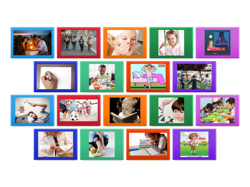 get up, wash my face, get dressed, comb my hair, have breakfast, brush my teeth, put on my shoes, go to school, read, write, have lunch, have dinner, play football, do my homework, play with my friends, go back home, wake up, go to bed ,