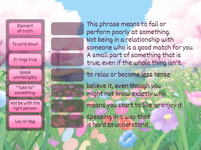 Not be with the right person: - Not being in a relationship with someone who is a good match for you., Speak unintelligibly - Speaking in a way that is hard to understand., Lay an egg - This phrase means to fail or perform poorly at something., "Take to" something: - means you start to like or enjoy it, To wind down - to relax or become less tense, Element of truth: - A small part of something that is true, even if the whole thing isn't., It rings true - believe it, even though you might not know exactly why.,