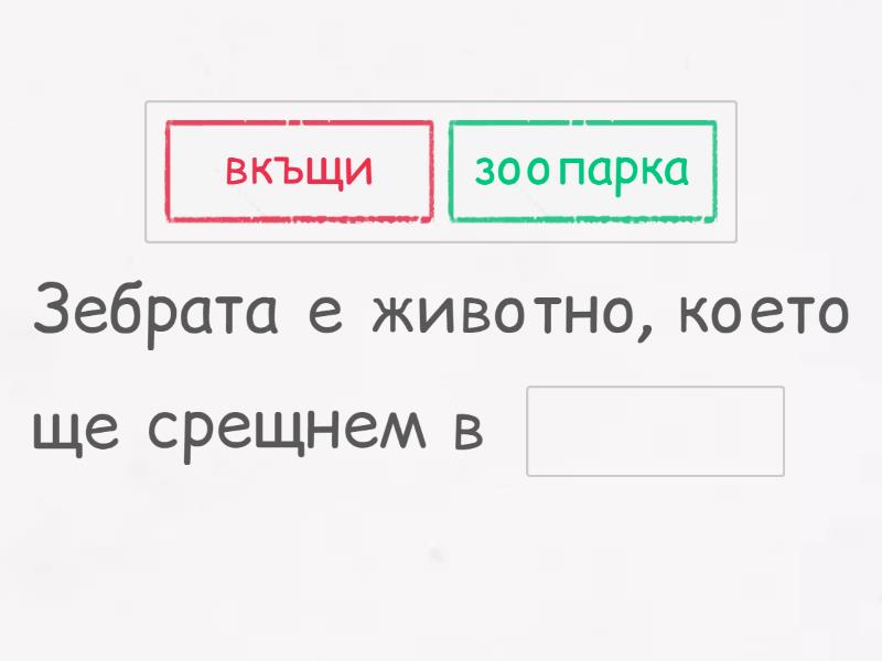 Зебрата е животно, което ще срещнем в ____ Котката е ____ Лъва е ____ Жирафа живее ____ Кучето е ____