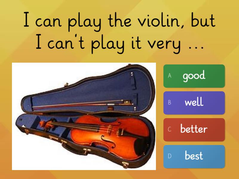 1) I can play the violin, but I can´t play it very ... a) good b) well c) better d) best 2) He isn´t very ... at dancing. a) good b) well c) better d) best 3) I´m ... at skiing than she is. a) good b) well c) better d) best 4) People say that his pictures are as ... as Peter´s pictures. a) good b) well c) better d) best 5) Walking is ... than driving when you want to see everything. a) good b) well c) better d) best 6) The ... singer of their class is Tony. a) good b) well c) better d) best 7) Are you a ... basketball player? a) good b) well c) better d) best 8) We can swim ... a) good b) well c) better d) best 9) He is my ... friend of all. a) good b) well c) better d) best