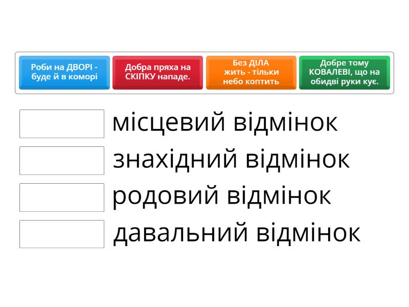 Без ДІЛА жить - тільки небо коптить - родовий відмінок, Добре тому КОВАЛЕВІ, що на обидві руки кує. - давальний відмінок , Добра пряха на СКІПКУ нападе. - знахідний відмінок , Роби на ДВОРІ - буде й в коморі - місцевий відмінок ,