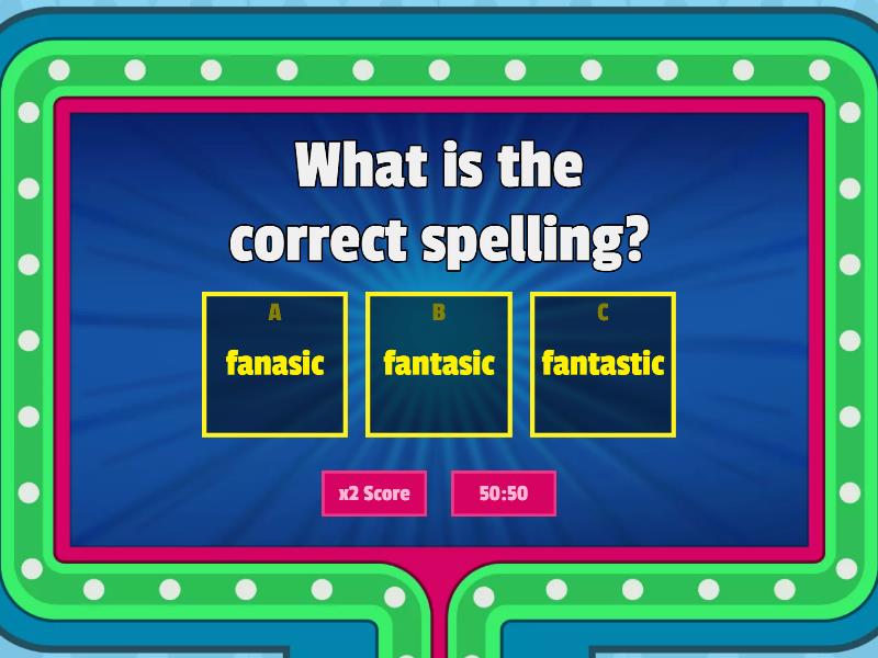 1) What is the correct spelling? a) fanasic b) fantasic c) fantastic 2) What is the correct spelling? a) becus b) because c) beecause 3) What is the correct spelling? a) their b) thier c) theire 4) What is the correct spelling? a) yu b) yuw c) you 5) What is the correct spelling? a) Febuary b) February c) Febary 6) What is the correct spelling? a) wos b) wass c) was 7) What is the correct spelling? a) undergrowned b) undergrownd c) underground 8) What is the correct spelling? a) clever b) clevver c) cleva 9) What is the correct spelling? a) childen b) childeren c) children 10) What is the correct spelling? a) tunnel b) tunnle c) tunnul