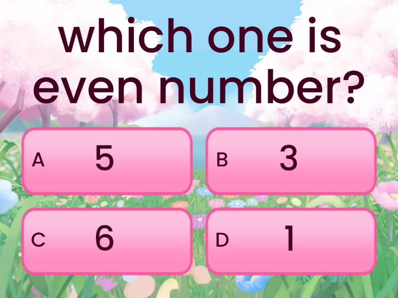1) which one is even number? a) 5 b) 6 c) 1 d) 3 2) which one is odd number a) 0 b) 4 c) 3 d) 8 3) which one is smallest even number? a) 0 b) 1 c) 2 d) 3 4) which one smallest odd number a) 0 b) 3 c) 4 d) 2 5) is 0 is even? a) yes b) no