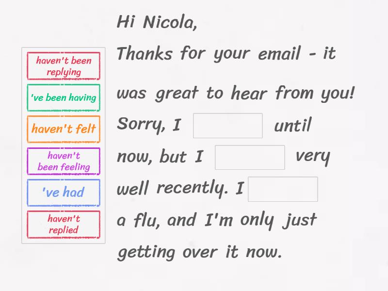 Hi Nicola, Thanks for your email - it was great to hear from you! Sorry, I ____ until now, but I ____ very well recently. I____ a flu, and I'm only just getting over it now. I ____ to work for a week; I____ on the sofa at home all day. My mum ____ after me all week, and I'm nearly better now. I'll probably go back to work. Anyway, I'm glad you're planning on coming to visit next summer - it will be lovely to see you! While I've been off work, I ____ about what we can do while you're here, and I____ with a few ideas. I know how much you love music, so for the last few days I____ to get some tickets for a music festival, but I ____ to get any yet. Is there anything else you'd like to do during the visit? I'm really looking forward to seeing you, and I know we will have a fantastic time. Write back soon! Love, Sophie