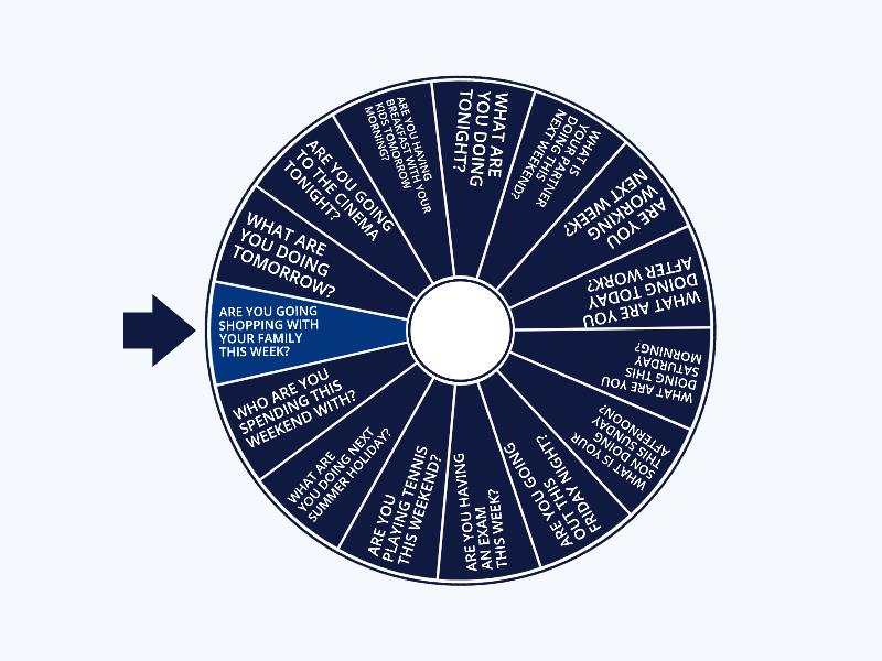 1) WHAT ARE YOU DOING TOMORROW? 2) ARE YOU GOING TO THE CINEMA TONIGHT? 3) ARE YOU HAVING BREAKFAST WITH YOUR KIDS TOMORROW MORNING?  4) WHAT ARE YOU DOING TONIGHT? 5) WHAT IS YOUR PARTNER DOING THIS NEXT WEEKEND? 6) ARE YOU WORKING NEXT WEEK? 7) WHAT ARE YOU DOING TODAY AFTER WORK? 8) WHAT ARE YOU DOING THIS SATURDAY MORNING? 9) WHAT IS YOUR SON DOING THIS SUNDAY AFTERNOON? 10) ARE YOU GOING OUT THIS FRIDAY NIGHT? 11) ARE YOU HAVING AN EXAM THIS WEEK?  12) ARE YOU PLAYING TENNIS THIS WEEKEND?  13) WHAT ARE YOU DOING NEXT SUMMER HOLIDAY? 14) WHO ARE YOU SPENDING THIS WEEKEND WITH? 15) ARE YOU GOING SHOPPING WITH YOUR FAMILY THIS WEEK?