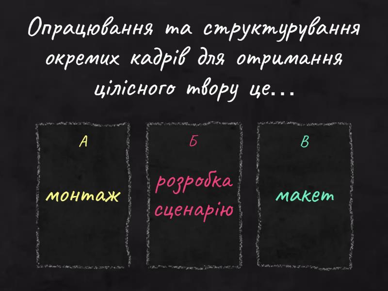 1) Опрацювання та структурування окремих кадрів для отримання цілісного твору це… a) монтаж b) розробка сценарію c) макет 2) Під цим терміном розуміють широкий спектр технологій запису, обробки, передачі, зберігання й відтворення візуального і аудіовізуального матеріалу на моніторах це… a) відео b) аудіо c) контент d) текстові файли 3) Один або кілька текстових об’єктів, що з’являються на початку відеофільму це… a) ефекти переходу b) візуальні ефекти c) титри d) заголовок 4) Текстові об’єкти, що з’являються або поверх відео та використовуються для пояснення зображення, або в кінці відео та містять відомості про авторів відеофільму це… a) заголовок b) титри c) візуальні ефекти d) ефекти переходу 5) Використовуються для зміни зовнішнього викладу зображення, наприклад, переходу до чорно-білого зображення або досягнення ефекту старого кіно це… a) заголовок b) титри c) візуальні ефекти d) ефекти переходу 6) Число нерухомих зображень, що послідовно змінюються одне за одним впродовж однієї секунди відеоматеріалу, створюючи ефект руху об'єктів на екрані це… a) роздільна здатність b) розгортка c) співвідношення сторін кадру d) число кадрів за секунду 7) Горизонтальне і вертикальне розділення , що вимірюється у пікселях це… a) роздільна здатність b) число кадрів за секунду c) розгортка d) співвідношення сторін кадру 8) Детальний план послідовності окремих кадрів фільму, розміщення окремих об’єктів це… a) розробка сценаріїю b) макет c) документ 9) Комбінування різних форм представлення інформації на одному носієві, наприклад текстової, звукової і графічної, або, останнім часом все частіше - анімації і відео це… a) мультимедіа b) аудіо файли c) відео файли d) презентації 10) Пристрій або програма, здатна виконувати перетворення потоку даних або сигналу це… a) конвертація b) кодек c) відеоредактор 11) Програмне забезпечення, що включає в себе набір інструментів, які дозволяють редагувати відеофайли це.. a) конвертація b) аудіоредактор c) відеоредактор 12) Цифровий відеозапис інформації, виведеної на екран комп'ютера, також відома як video screen capture a) скрінкаст b) монтаж c) авторинг d) стиснення