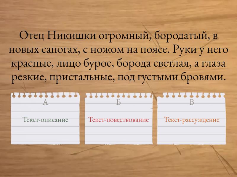 1) Отец Никишки огромный, бородатый, в новых сапогах, с ножом на поясе. Руки у него красные, лицо бурое, борода светлая, а глаза резкие, пристальные, под густыми бровями. a) Текст-описание b) Текст-повествование c) Текст-рассуждение 2) В чём же было преимущество этой породы собак? Во-первых, хаски очень выносливы и могут бежать с огромной скоростью. Во-вторых, они способны быстро перевозить людей из одного пункта назначения в другой. a) Текст-описание b) Текст-повествование c) Текст-рассуждение 3) Уставшие дети едва дошли до хуторка. Они заглянули в крайнюю хату попросить воды. Из хаты вышла женщина. Она достала из колодца воду и дала им. a) Текст-описание b) Текст-повествование c) Текст-рассуждение