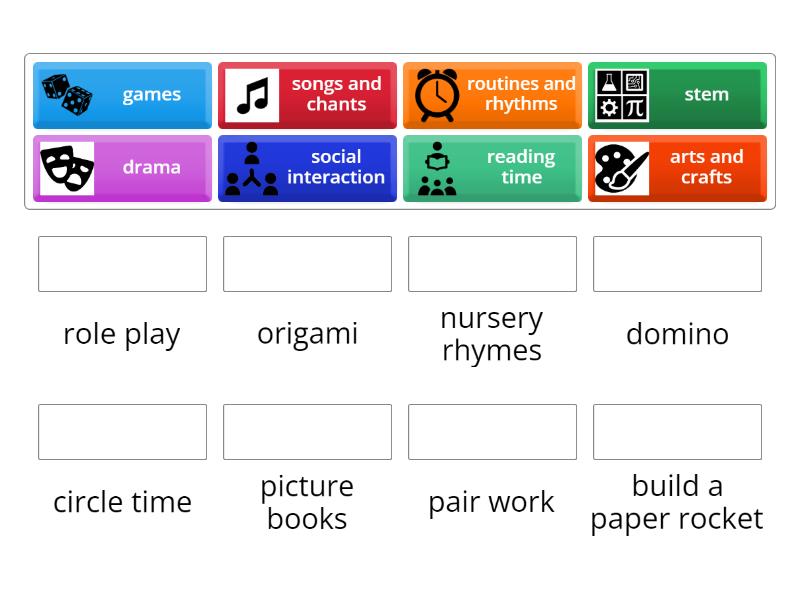 drama - role play, arts and crafts - origami, songs and chants - nursery rhymes, games - domino, routines and rhythms - circle time, reading time - picture books, social interaction - pair work, stem - build a paper rocket,