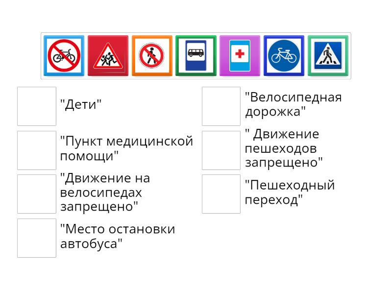 "Пешеходный переход", "Место остановки автобуса", "Велосипедная дорожка", "Пункт медицинской помощи", "Движение на велосипедах запрещено", "Дети", " Движение пешеходов запрещено",