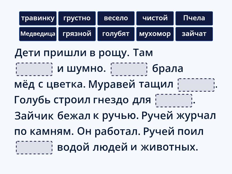 Дети пришли в рощу. Там ____ и шумно. ____ брала мёд с цветка. Муравей тащил ____. Голубь строил гнездо для ____. Зайчик бежал к ручью. Ручей журчал по камням. Он работал. Ручей поил ____ водой людей и животных. У утки были пушистые ____. Однажды лисица утащила утку. Мы ____ собаку водить к реке утят. Вот собака важно идёт к ____. Утята спешат за ней. Утята ныряют в ____. Потом они гуляют на лугу. ____ сидит и зорко охраняет утят. Лев и медведь добыли мясо и стали за него ____. Медведь не хотел уступать, и ____ не уступал. Они так долго бились, что ослабели оба и ____. Лисица увидала их мясо, подхватила его и ____. Ходила курочка с ____ по двору. Вдруг пошел дождь. Курочка скорей на землю ____, все перышки растопырила и заквохтала. Это значит: прячьтесь скорей. И все ____ залезли к ней под крылышки. Кто совсем спрятался, у кого только ножки видны, у кого ____ торчит, у кого глаз выглядывает. Не страшен дождь ____!