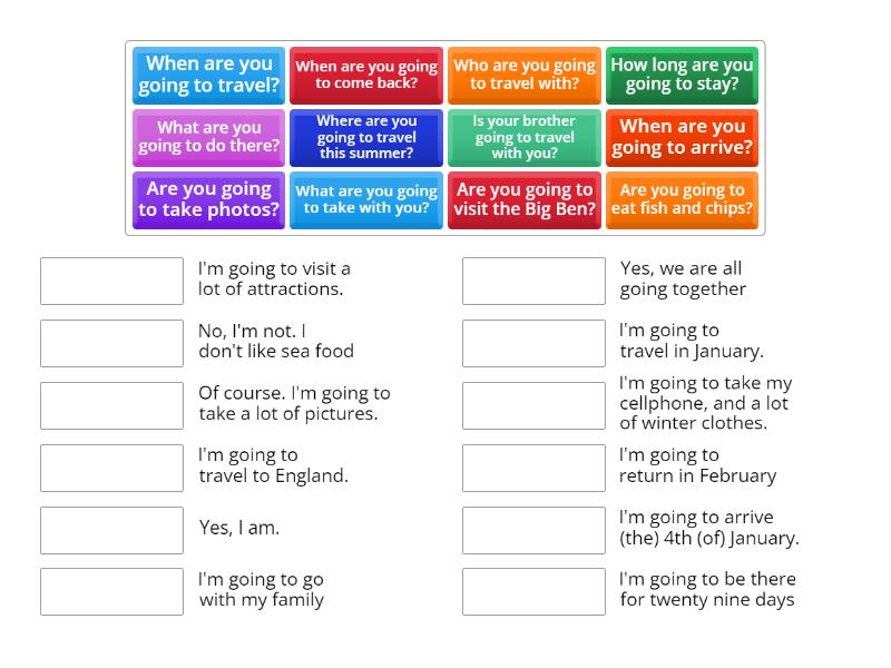 Where are you going to travel this summer? - I'm going to travel to England., When are you going to travel? - I'm going to travel in January., When are you going to arrive? - I'm going to arrive (the) 4th (of) January., Who are you going to travel with? - I'm going to go with my family, How long are you going to stay? - I'm going to be there for twenty nine days, What are you going to do there? - I'm going to visit a lot of attractions., What are you going to take with you? - I'm going to take my cellphone, and a lot of winter clothes., When are you going to come back? - I'm going to return in February, Are you going to visit the Big Ben? - Yes, I am., Are you going to eat fish and chips? - No, I'm not. I don't like sea food, Is your brother going to travel with you? - Yes, we are all going together, Are you going to take photos? - Of course. I'm going to take a lot of pictures.,