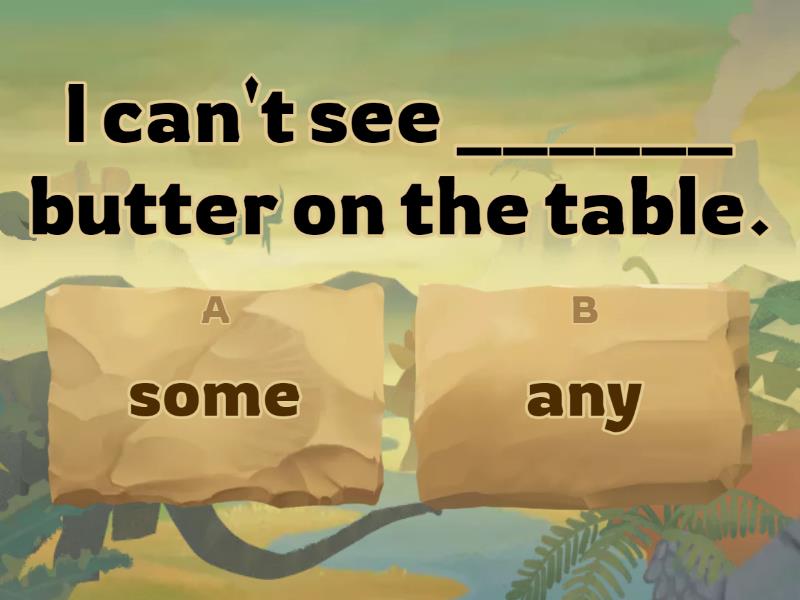 1) I can't see ______ butter on the table. a) some b) any 2) There aren't ________ prawns on the table. a) any b) some 3) I always have ________ crisps for the break. a) some b) any 4) Have we got ______ rice in the cupboard? a) any b) some 5) I'm making _____ pasta. Are u hungry? a) some b) any 6) Are there _______ mushrooms on the pizza? a) any b) some