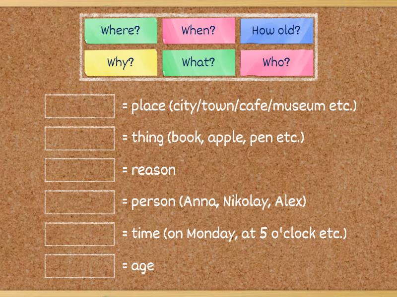 When? - = time (on Monday, at 5 o'clock etc.), Where? - = place (city/town/cafe/museum etc.), What? - = thing (book, apple, pen etc.), How old? - = age, Who? - = person (Anna, Nikolay, Alex), Why? - = reason ,