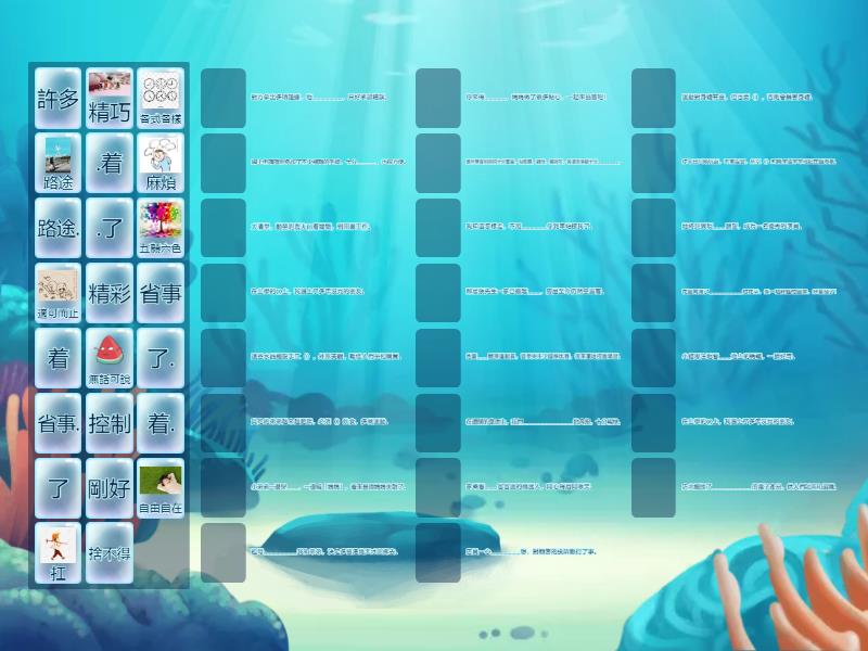 捨不得 - 祖母________我和弟弟,決定多留港幾天才回鄉去。, 自由自在 - 在遼闊的草原上,我們_____________地奔跑,十分暢快。, 五顏六色 - 花園開滿了_________的花朵,像一幅鮮豔的圖畫,好看極了!, 精彩 - 嘉年華會的節目十分豐富,有歌舞、雜技、魔術等,各項表演都十分_______。, 各式各樣 - 店內擺放了__________的電子產品,供人們試用和選購。, .了 - 她終於實現___願望,成為一名優秀的演員。, .着 - 家樂看___爸爸送的機器人,開心得眉開眼笑。, 了. - 鄰居張先生一家已搬離___,房屋至今仍然空置着。, 着. - 小弟弟一邊哭___,一邊喊「媽媽」,看來是跟媽媽失散了。, 了 - 他當___體操運動員,曾參與不少國際比賽,後來重返校園學習。, 着 - 小貓專注地看___地上的螞蟻,一臉好奇。, 控制 - 貧吃的弟弟越來越肥胖,必須()飲食,多做運動。, 精巧 - 這些水晶擺設手工(),外形美觀,難怪人們爭相購買。, 許多 - 你平日只顧玩耍,不常溫習,所以()知識未能牢牢地記在腦海裏。, 適可而止 - 運動對身體有益,但也要(),否則會損害身體。, 路途 - 在上學的( )上,我遇上了多年沒見的朋友。, 路途. - 在上學的( )上,我遇上了多年沒見的朋友。, 扛 - 大清早,勤勞的農夫( )着鋤頭,到田裏工作。, 無話可說 - 對方拿出多項證據,他_______,只好承認錯誤。, 剛好 - 你來得_____,媽媽做了很多點心,一起來品嘗吧!, 麻煩 - 我知道怎樣走,不用______你到車站接我了。, 省事 - 店員一心_______想,對顧客的投訴敷衍了事。, 省事. - 網上申請護照免卻了不少複雜的手續,十分_____,也很方便。,
