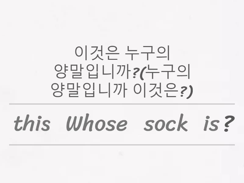 Whose sock is this? - 이것은 누구의 양말입니까?(누구의 양말입니까 이것은?), It is Stacy's. - 그것은 스태이시의 것 입니다.(그것은 입니다. 스태이시의 것), It looks like a fish. - 그것은 물고기처럼 생겼어요.(그것은 ~처럼 생겼어요. 물고기), Whose airplane is this? - 이것은 누구의 비행기입니까?(누구의 비행기입니까 이것은?), It's 덕구's airplane. - 그것은 덕구의 비행기입니다.(그것은 입니다. 덕구의 비행기), Whose eraser is that? - 저것은 누구의 지우개 입니까?(누구의 지우개입니까 저것은? ), It is mine. - 그것은 제 것입니다., Is this your towel? - 이것은 너의 타올이니?, Yes, it's mine. - 응, 그것은 내거야., No, it's Kevin's. - 아니오, 그것은 케빈의 것 입니다.(그것은 입니다. 케빈의 것), Look! What's that? - 봐! 저거 뭐야?, Can I use this? - 이것을 사용해요 될까요?(해도될까요? 사용하다. 이것을),