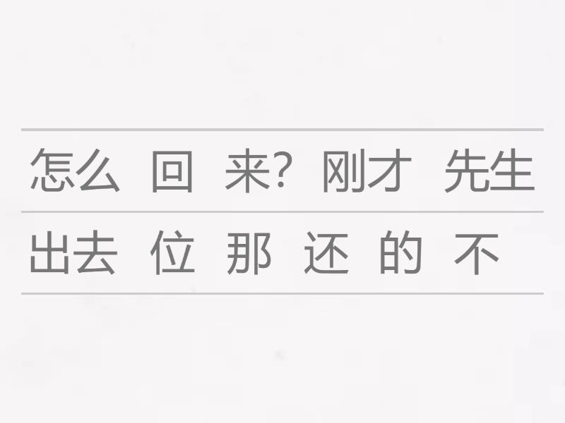 刚才 出去 的 那 位 先生 怎么 还 不 回 来?, 咱们 已经 十 年 没 有 见面 了 吗?, 你 是 什么 时候 开始 学 汉语 的?, 老师 和 同学们 都 在 等 着 我们 呢, 你 找 个 长 得 帅 的 中国 小伙子 做 丈夫。, 我们 为什么 要 问 师傅 那么 多 问题, 我 前年 就 不 当 老师 了, 现在 开了 一家 翻译 公司, 上 次 我 的 汉语 语法 考 得 糟糕 极了, 我 打算 从 现在 开始 在 办公室 打工, 七 点 半 我 在 你 家 东边 的 商场 等 你,