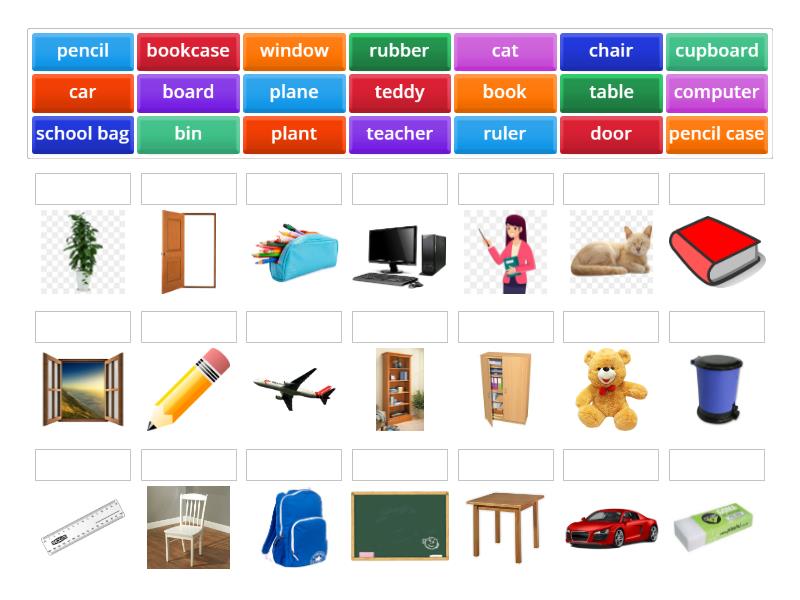 bin, window, cupboard, door, plant, teacher, computer, bookcase, chair, board, car, table, pencil case, school bag, pencil, plane, book, cat, teddy, rubber, ruler,